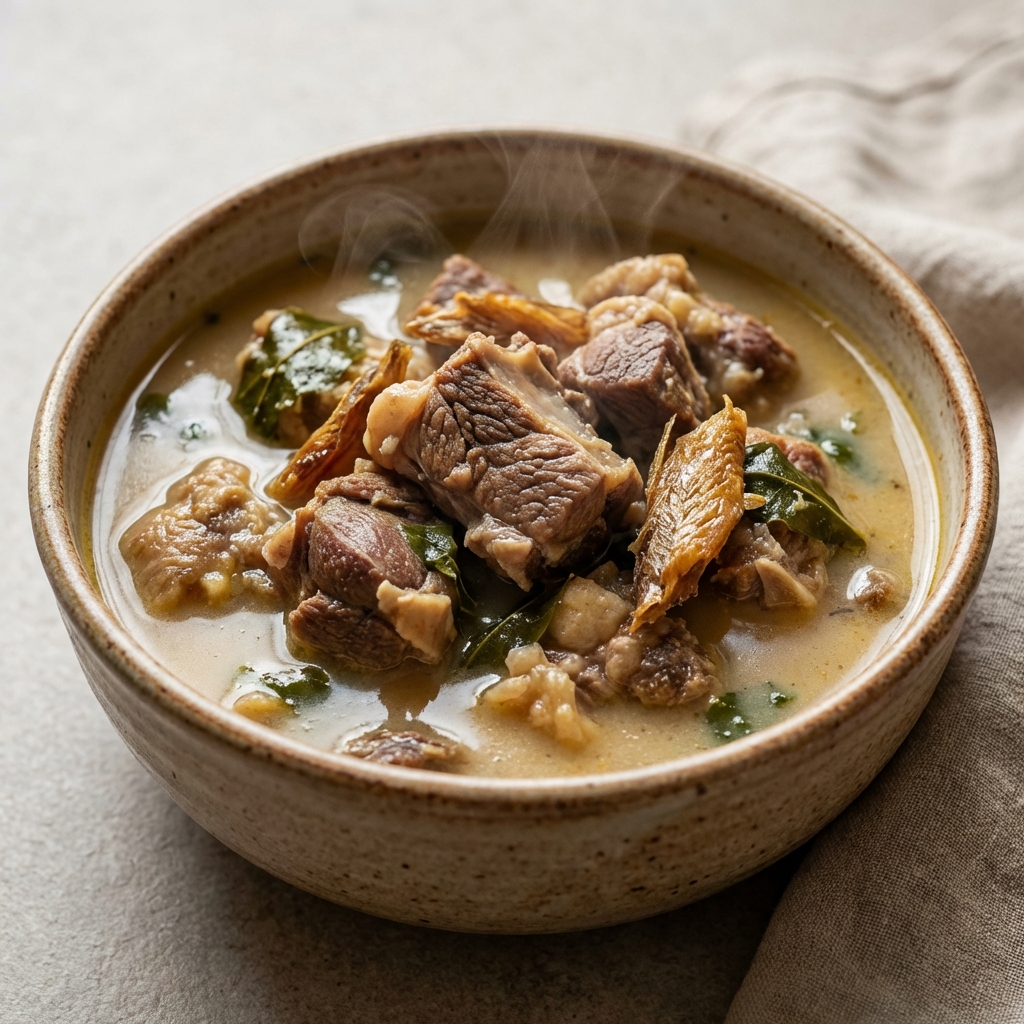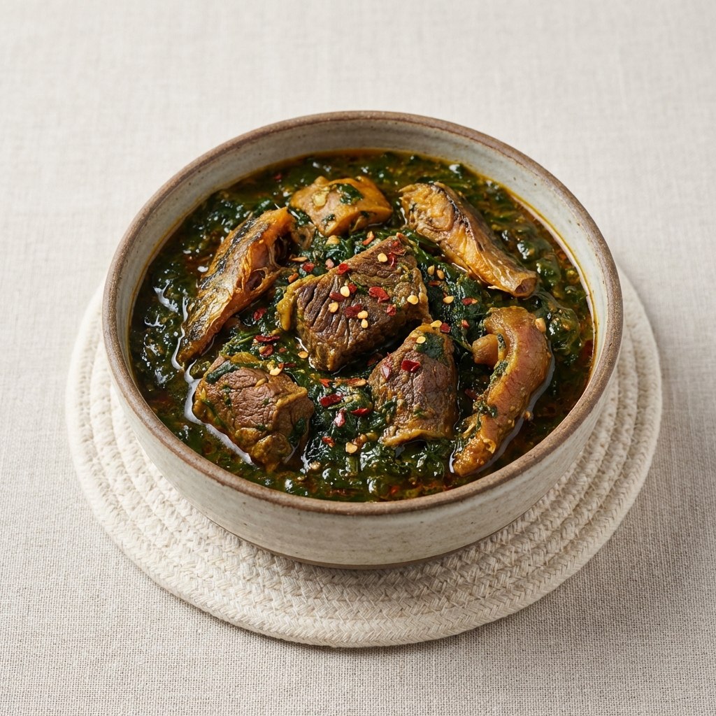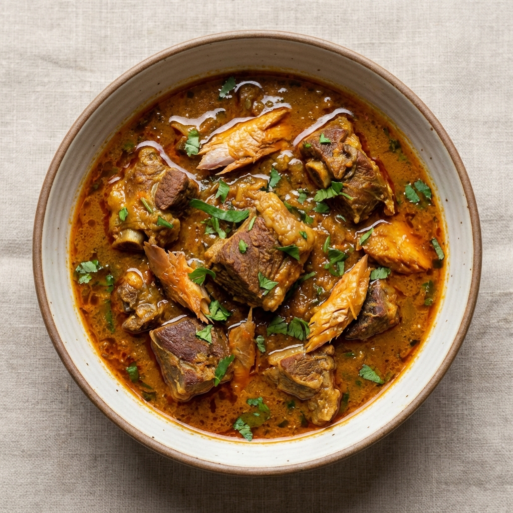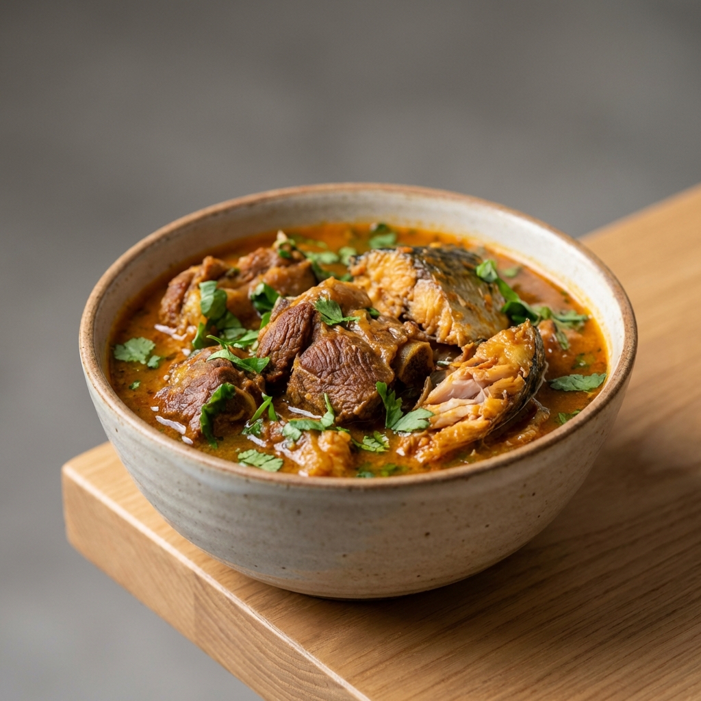 With goat meat or cowskin, smoked fish, periwinkle (on request)